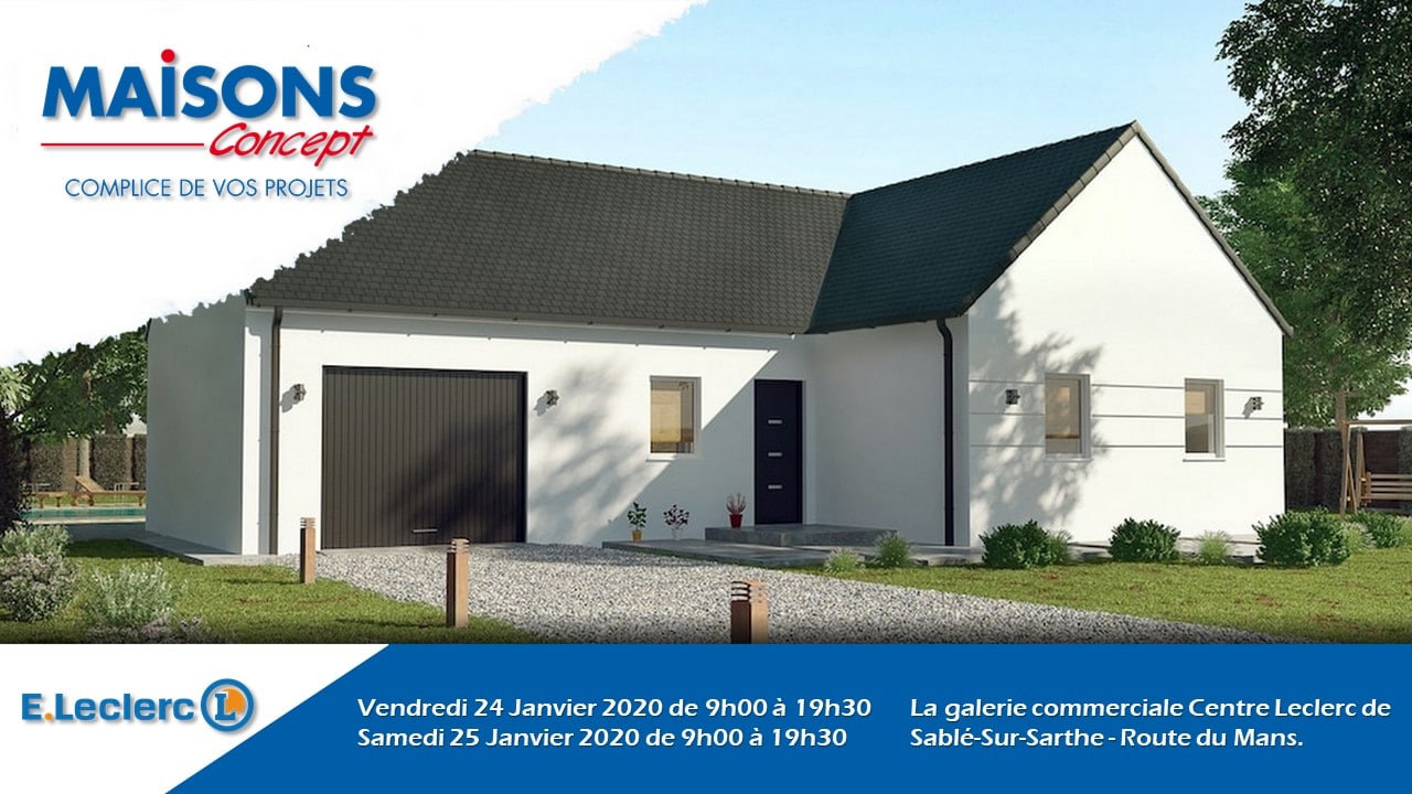 Envie de faire construire sur Sablé sur Sarthe ou en périphérie. Venez retrouver l’équipe Maisons Concept de Sablé dès Vendredi 24 Janvier 2020 de 9h00 à 19h30 et le Samedi 25 Janvier 2020 de 9h00 à 19h30 dans la galerie commerciale Centre Leclerc de Sablé-Sur-Sarthe – La Tuilerie, Route du Mans.