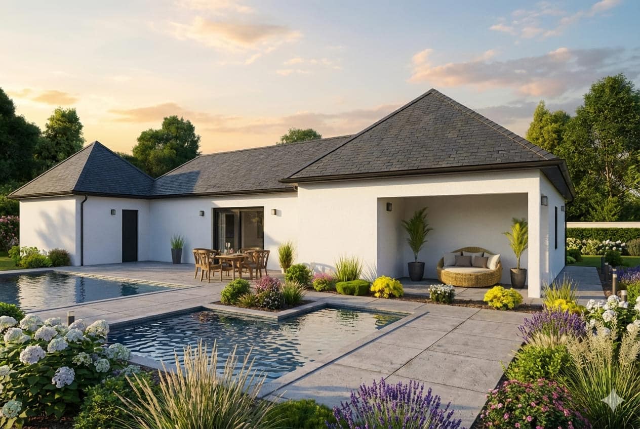 De nombreuses options telles son toit terrasse, ses panneaux photovoltaïques et son crépis coloré en font un modèle contemporain ancré dans la construction traditionnelle.